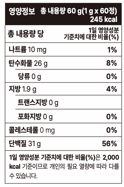 | 1000mg x 60정(60 g) | 결정셀룰로스 (434.00 mg) | 43.40 | 제형 안정화, 볼륨감 제공 | |