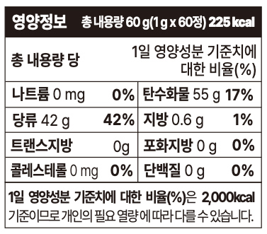 | 1일 1회, 1회 1정을 씹어서 섭취 | 이소말트DC (303.20 mg) | 30.32% | 설탕 대체 감미료, 혈당 부담 낮음, 저칼로리 | |