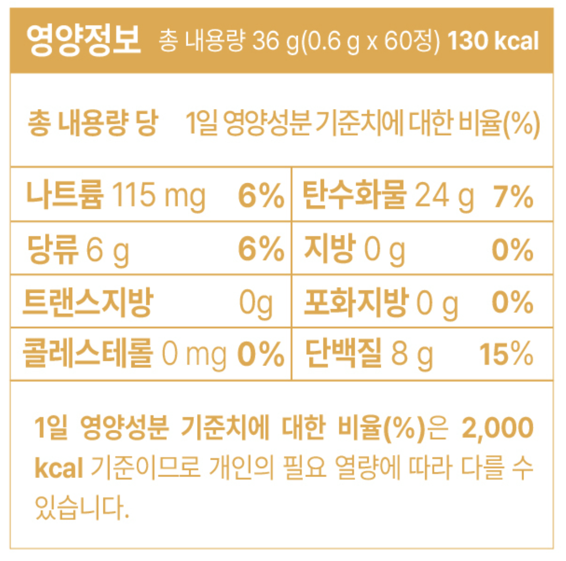 - 총 내용량: 600mg X 60정 ( 36g/130kcal )